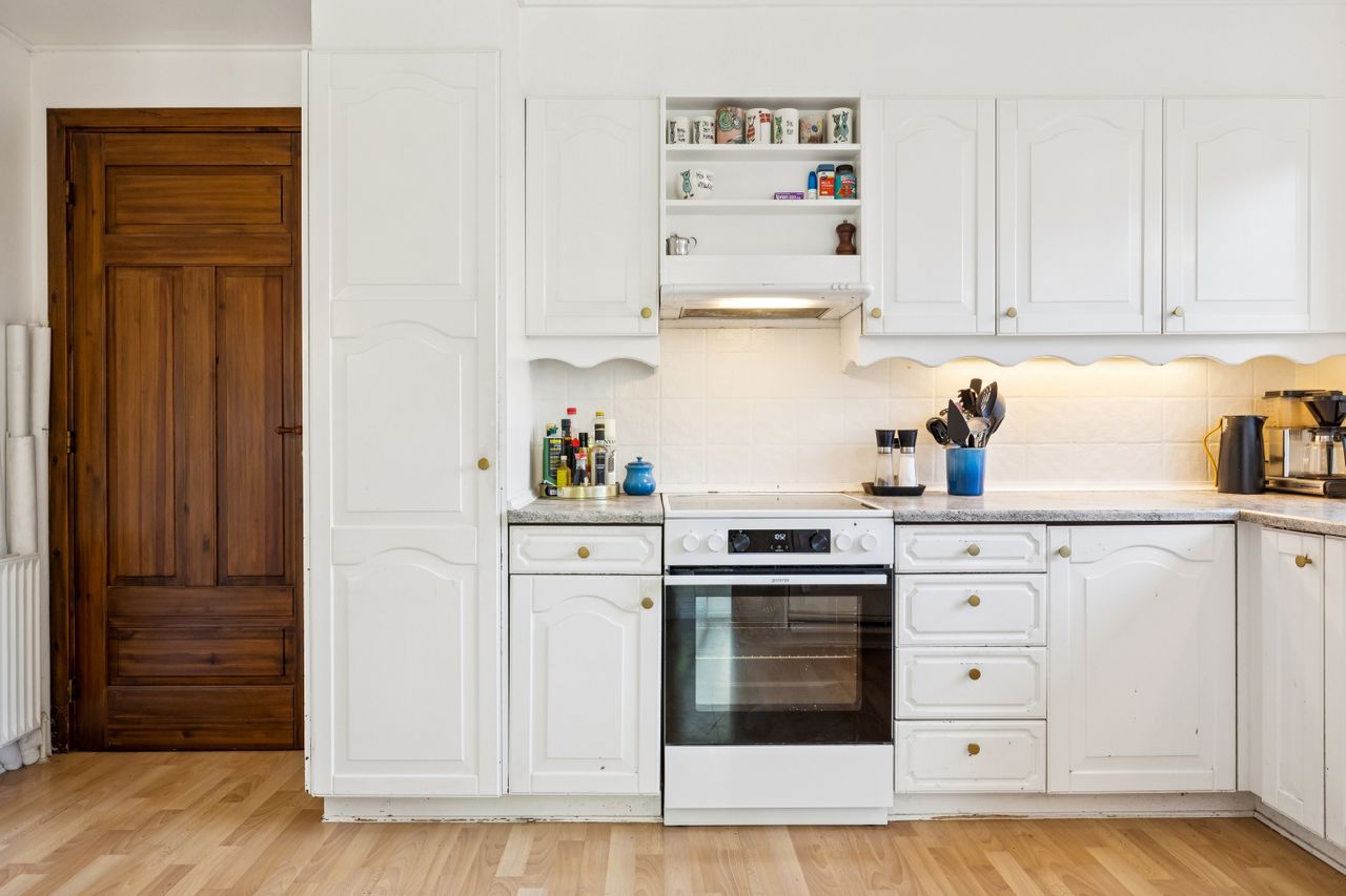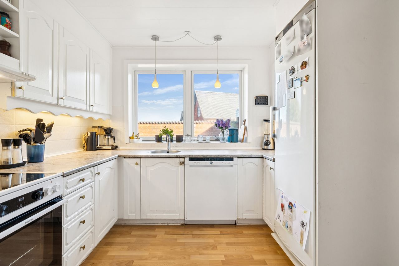 Køkkenet har lyst, malet inventar og god plads til madlavningen – Et lyst og praktisk køkken med et tidløst udtryk, der indbyder til både madlavning og samvær. Badeværelset er rummeligt med både badekar og bruseniche samt et lyst, hvidt vaskearrangement, og derudover finder du et gæstetoilet centralt placeret i huset.