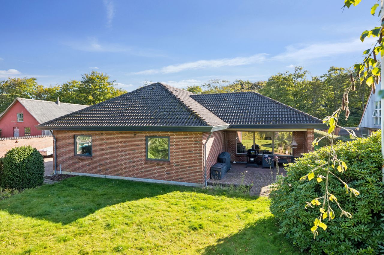 Den 1.232 m² store grund er anlagt med sans for både funktion og æstetik. Her er en stor, flisebelagt indkørsel, flere solrige terrasser samt en grøn plæne omkranset af træer, buske og et imponerende rhododendronbed. Her kan du nyde sommerdage i fred og ro – og børnene har god plads til leg og boldspil.