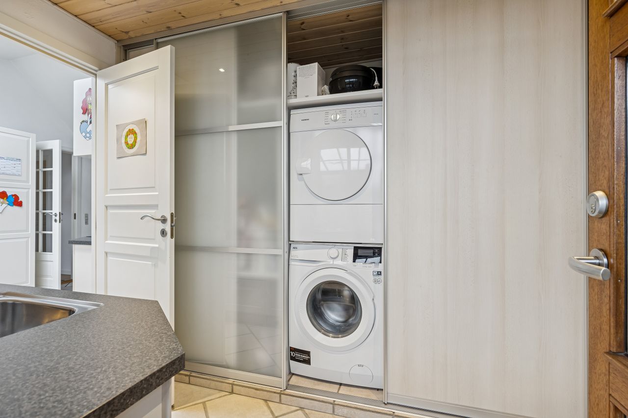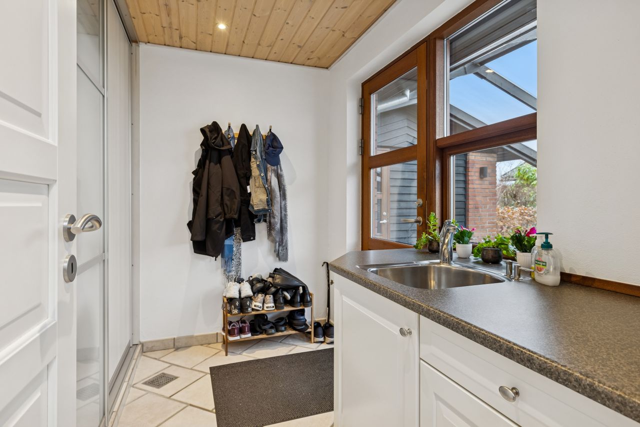 Indenfor mødes I af det praktiske bryggers, hvor gulvvarmen straks gør sin entré. Her er god plads, flotte skabe, skjult vaskesøjle og en funktionalitet, som gør hverdagen lettere.