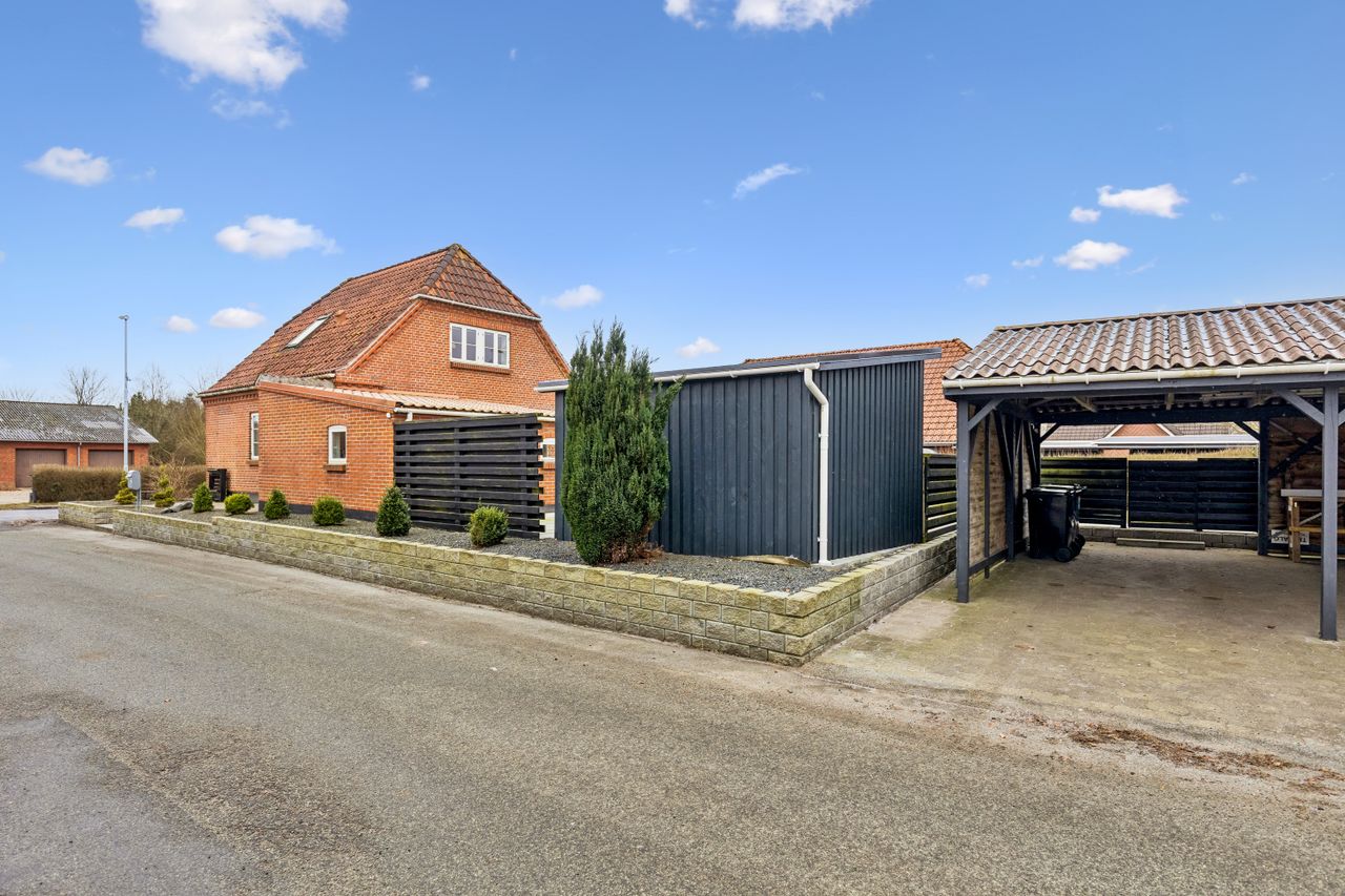 Til ejendommen hører en dobbelt carport på hele 36 m², opført i 2015, med god plads til både bil og opbevaring. Derudover får du et nyere træbeklædt udhus på 8 m², som er oplagt til cykler, haveredskaber og alt det praktiske, du gerne vil have lige ved hånden.
